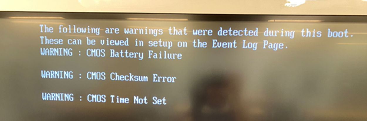 On peut voir sur cette image qu’il y’a une alerte au niveau du CMOS expliquant que la batterie ne fonctionne plus (Battery Failure) et que donc les autres paramètres ne peuvent pas fonctionner correctement