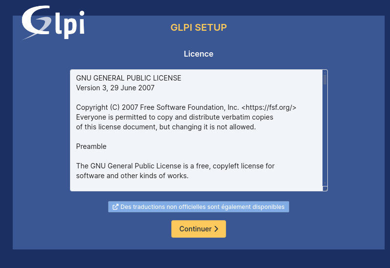 Super ! Je suis maintenant dans l'assistant d'installation de GLPI